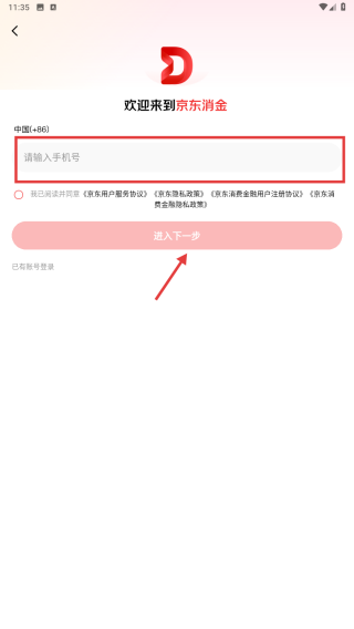4、输入手机号码,点击进入下一步按钮,进行后续登录操作。