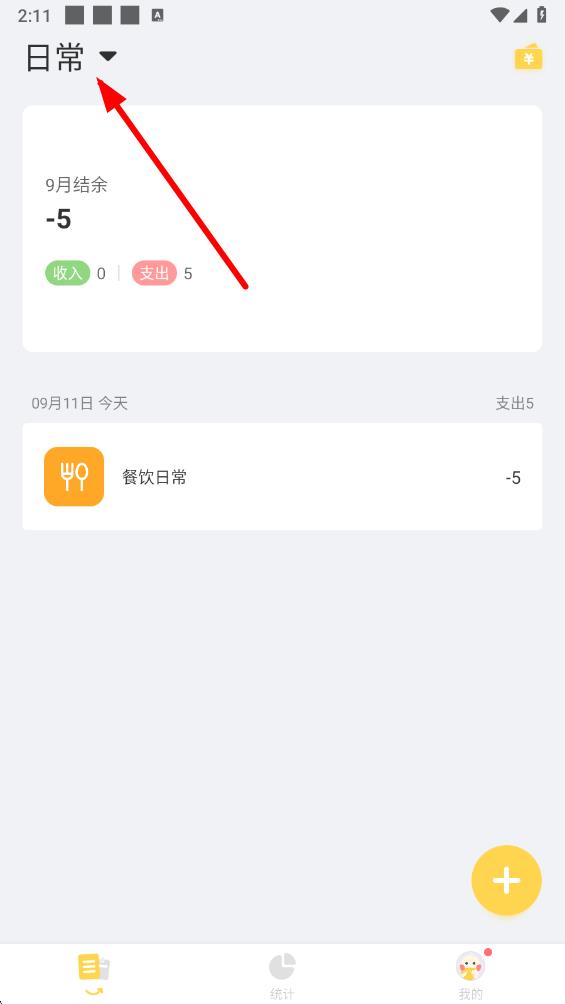 1、打开记账鸭应用,在首页点击左上角显示账本名称的下拉箭头。
