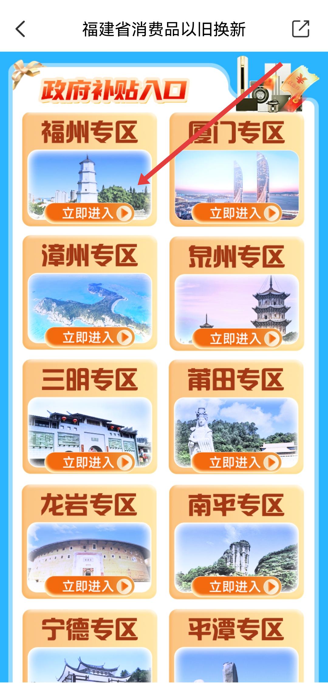 2、在福建省消费品以旧换新的页面,需要选择对应城市专区如福州专区,进入本地补贴领取界面。