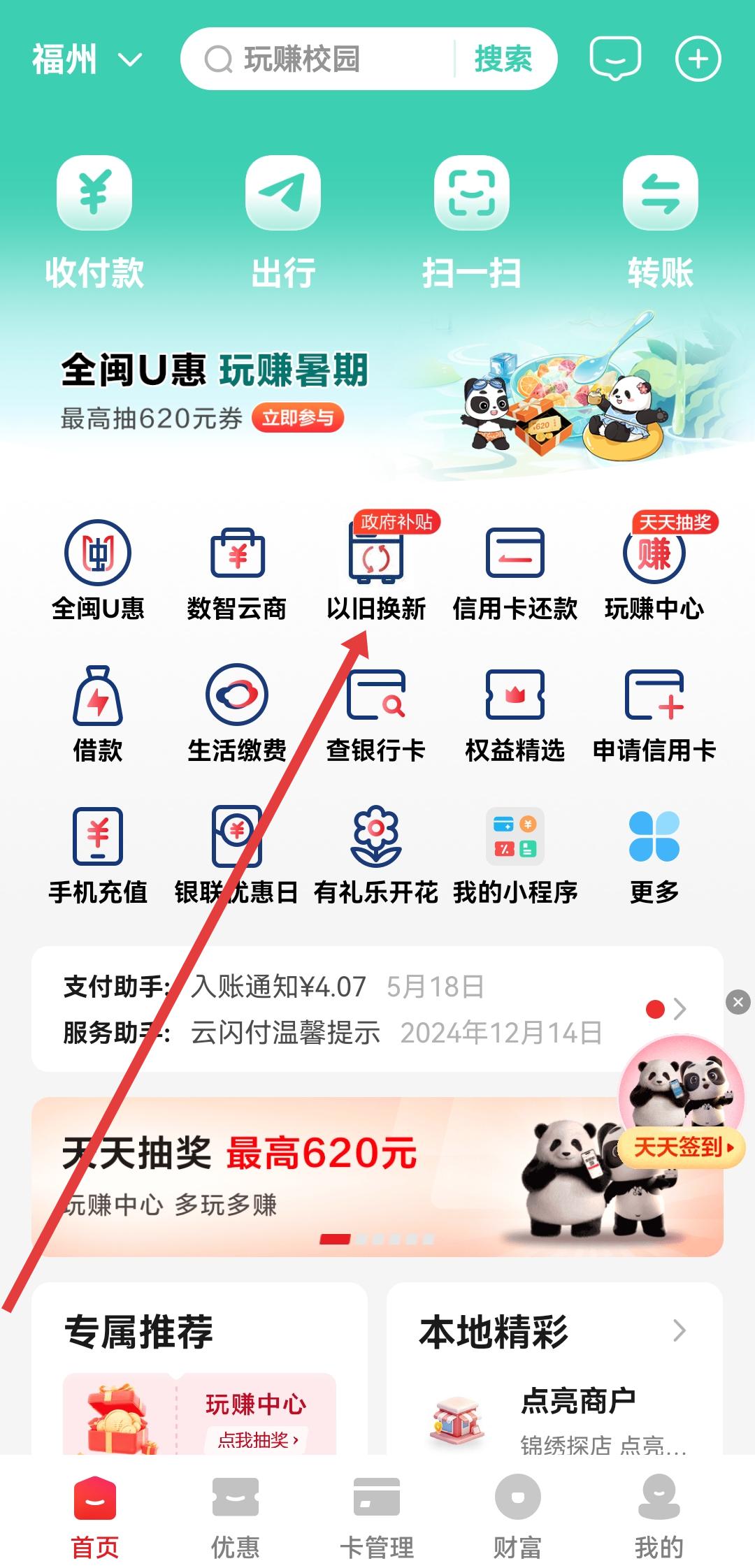 1、打开云闪付APP的首页,然后点击下面以旧换新的图标,进入政府补贴的活动页面。