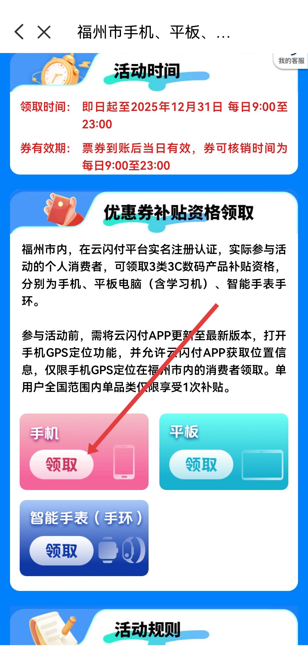 3、在优惠券补贴资格领取区域,点击对应品类如手机、平板、智能手表手环的领取按钮,即可抢国补券。