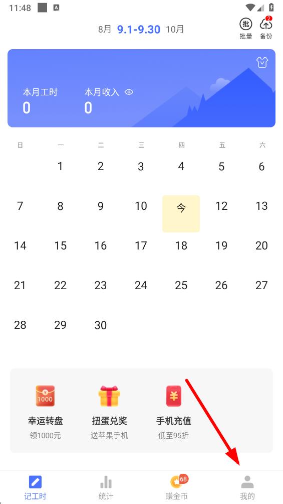 1、打开小时工记账应用,点击底部导航栏最右侧的我的选项,进入个人相关界面。