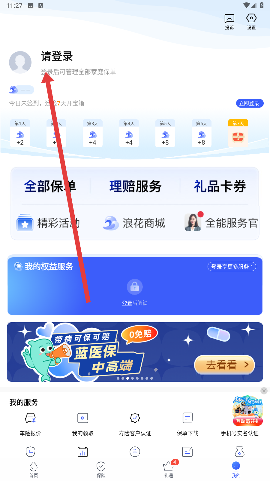 1、在太平洋保险app中我的个人主页点击上方的请登录按钮,可以开始执行登录操作。