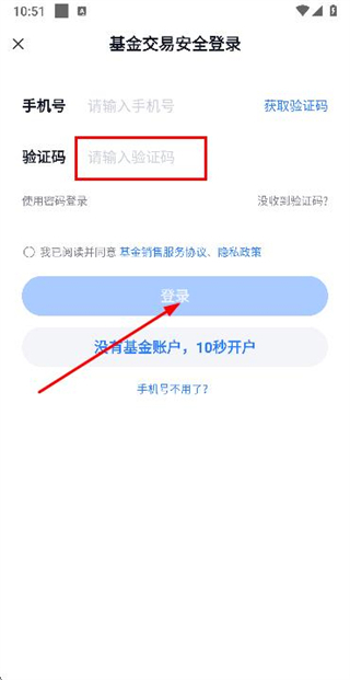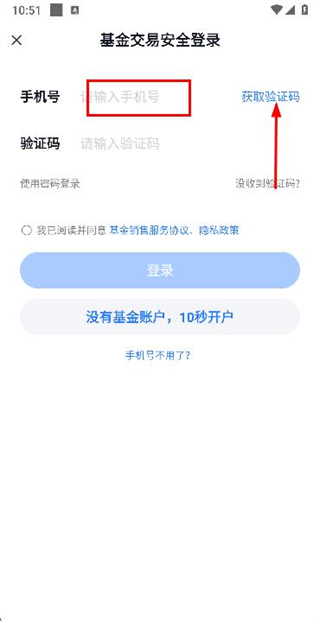 2、在手机登录页面填写手机号,勾选协议后,点击获取验证码。