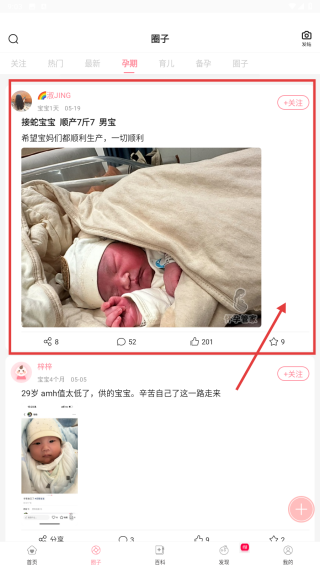 3、在孕期相关内容列表里,选择感兴趣的帖子,点击进入帖子正文页。