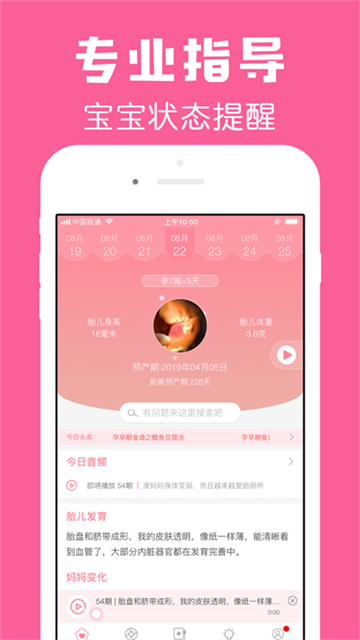 3、实用工具全面覆盖:包含温馨孕期小任务、个性化懒人日记,还有专业百科模块,满足孕妈记录、查询、规划等多方面孕期需求,提升孕期管理效率。