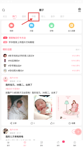 2、在圈子页面,点击孕期分类标签,进入孕期相关内容列表页。