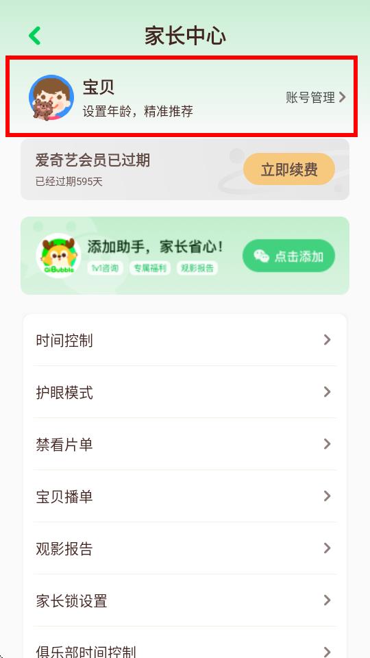1、打开爱奇艺奇巴布,进入家长中心界面,点击账号管理。