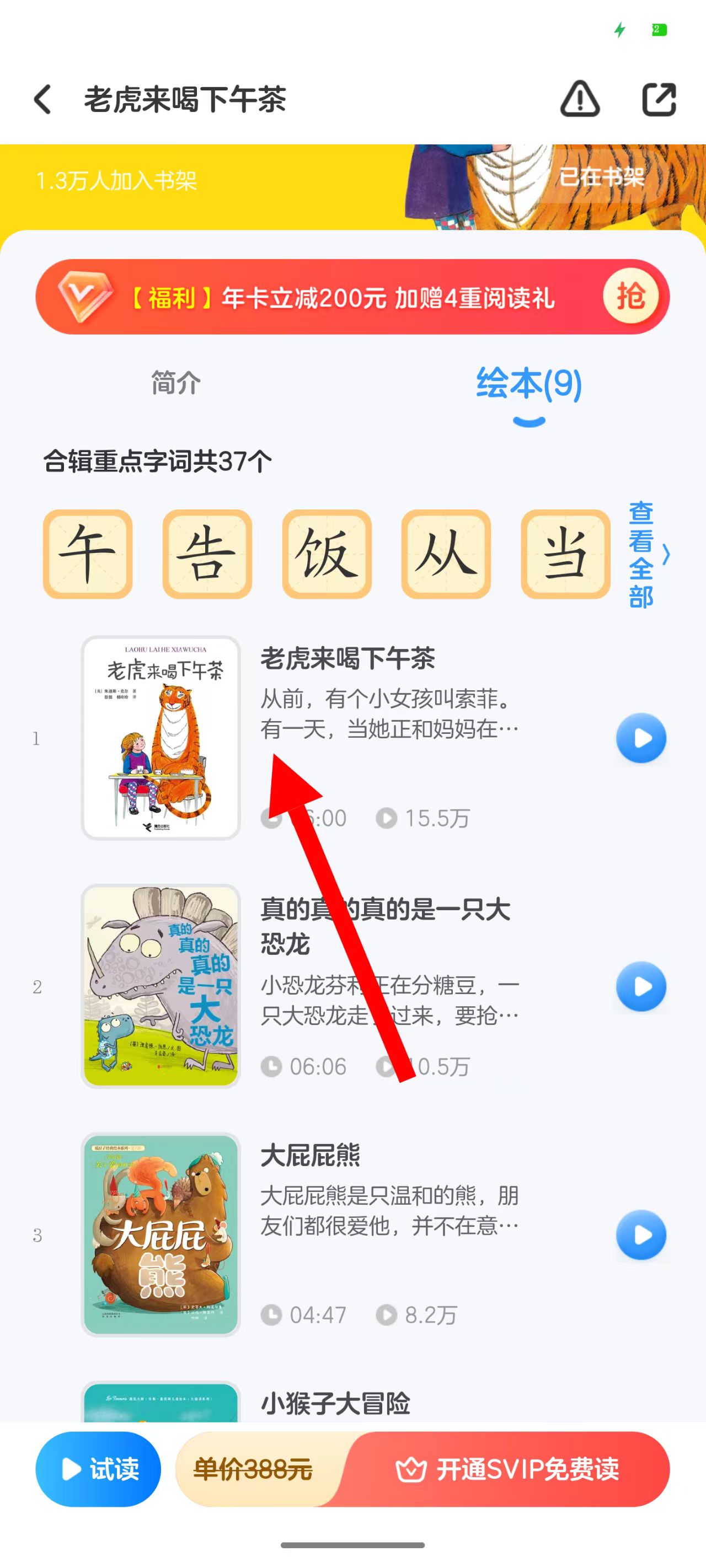 3、在合辑页面点击老虎来喝下午茶绘本,进入绘本详情页面。