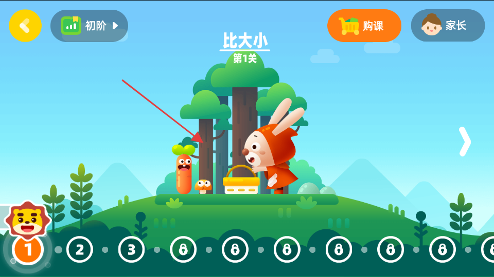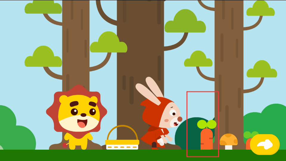 4、在关卡场景中,在小兔子面前的三个蔬菜中点击最大的胡萝卜,参与学习互动。