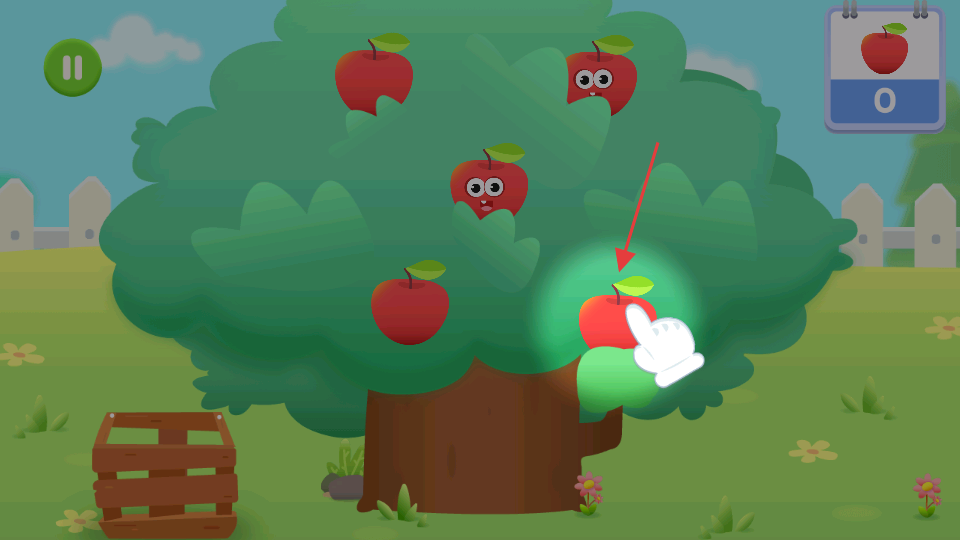 4、到达后,点击树上的苹果扔进苹果篮里,进行互动学习。