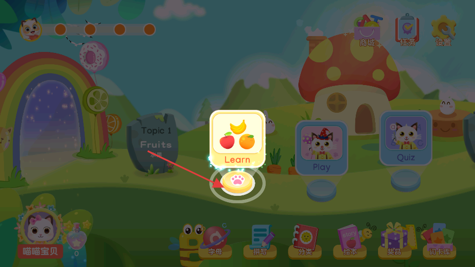 1、打开喵喵少儿英语,点击Learn按钮,进入学习流程。