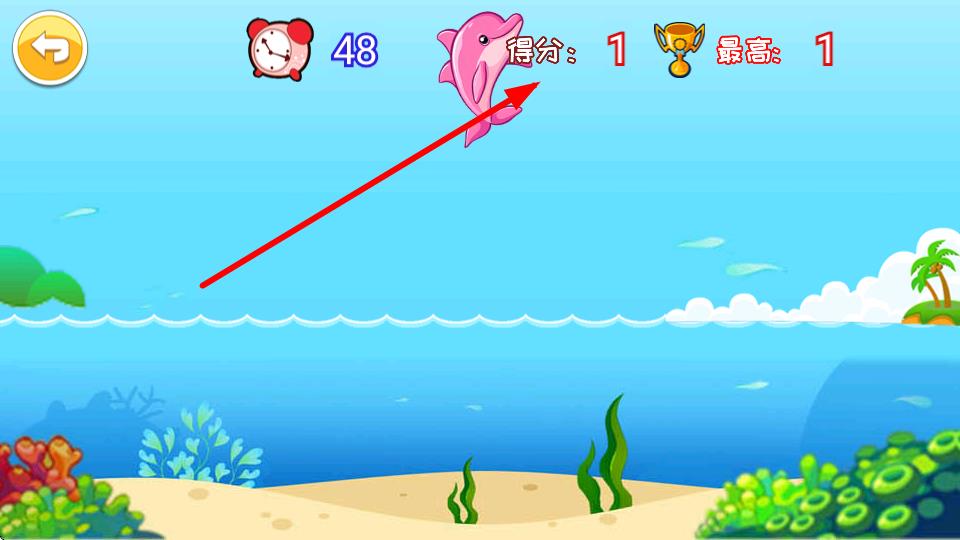 2、在游戏进行中持续点击粉色海豚,每成功点击一次,得分就会增加,如画面中显示从得分:0变为得分:1,不断点击来提升分数。