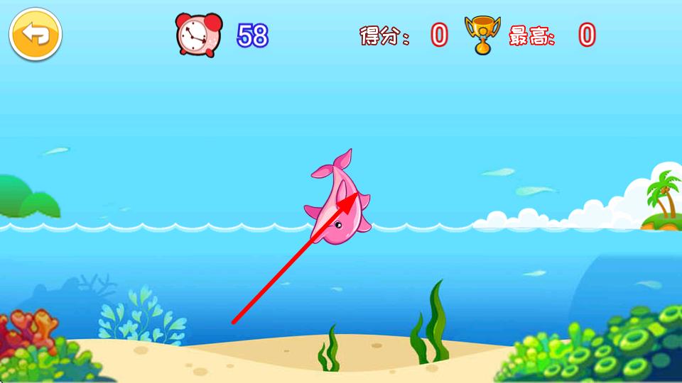 1、进入游戏后留意画面上方的58秒倒计时,快速点击屏幕中的粉色海豚,让海豚做出动作来开始积累分数。