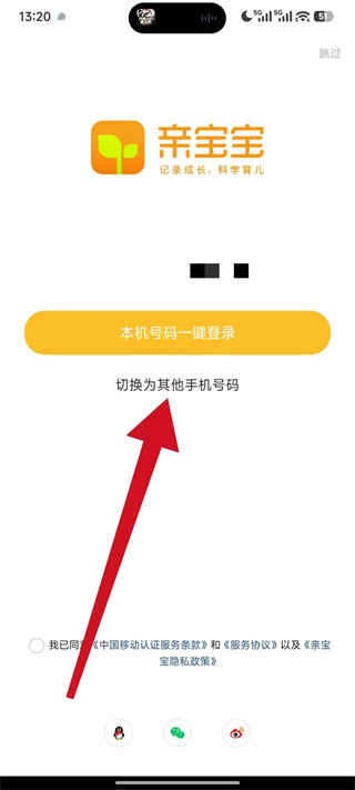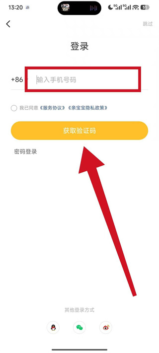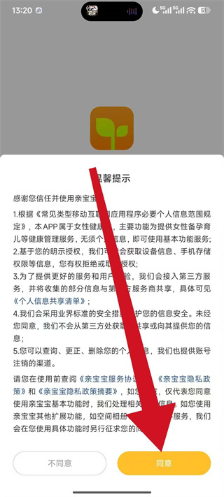 1、打开亲宝宝,弹出弹窗后,点击同意,进入登录选择页面。