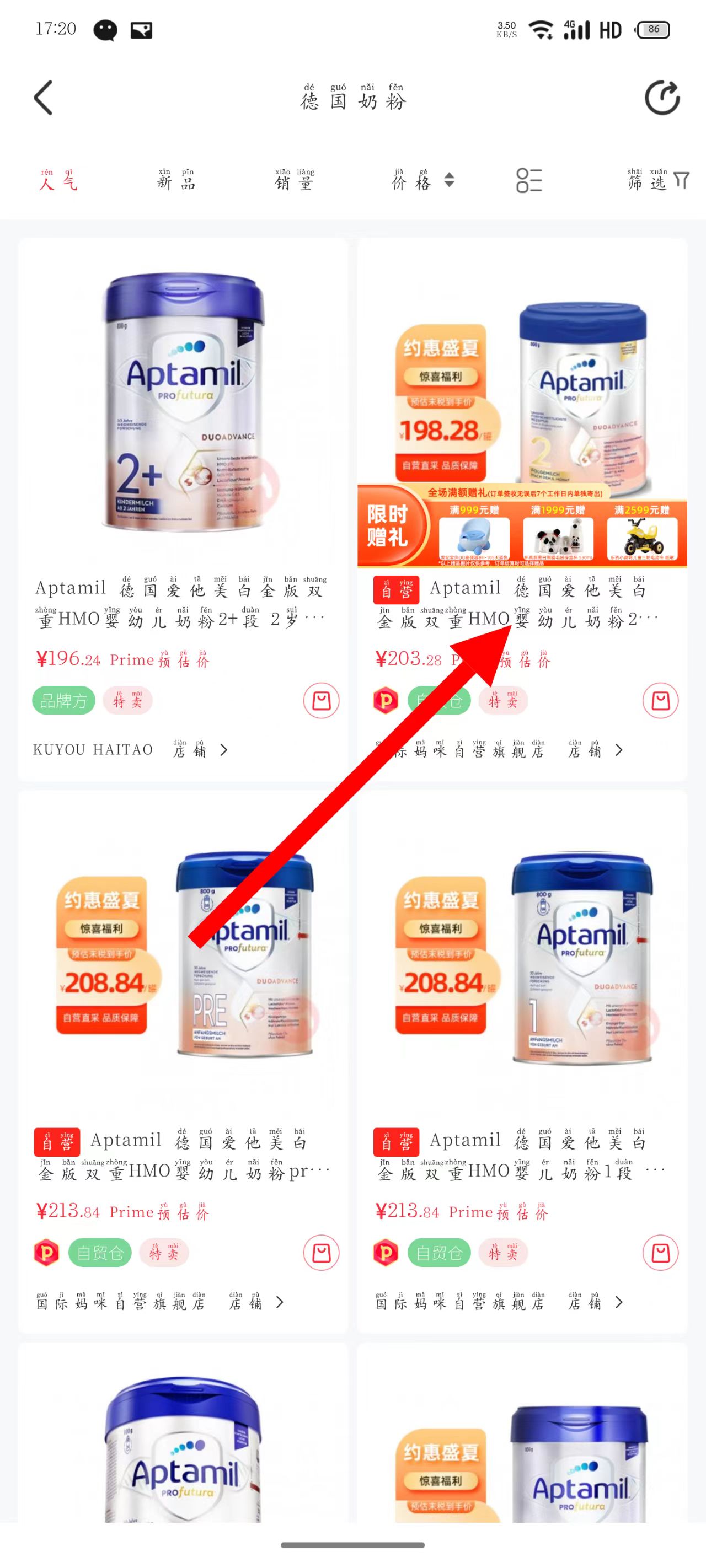 3、在德国奶粉列表页,选择想要的奶粉商品,点击进入商品详情页。