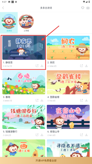 1、筛选适配内容:打开软件后,根据孩子年龄或学习需求,在分类板块中选择对应资源,如给低龄儿童选摇篮曲,给学龄儿童选唐诗三百首,精准匹配学习内容。