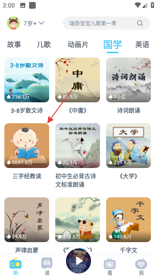 2、在国学页面,选择三字经教读,进入其详情页面。