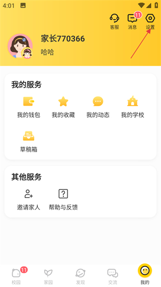1、点击掌通家园页面底部的我的,进入个人页面。