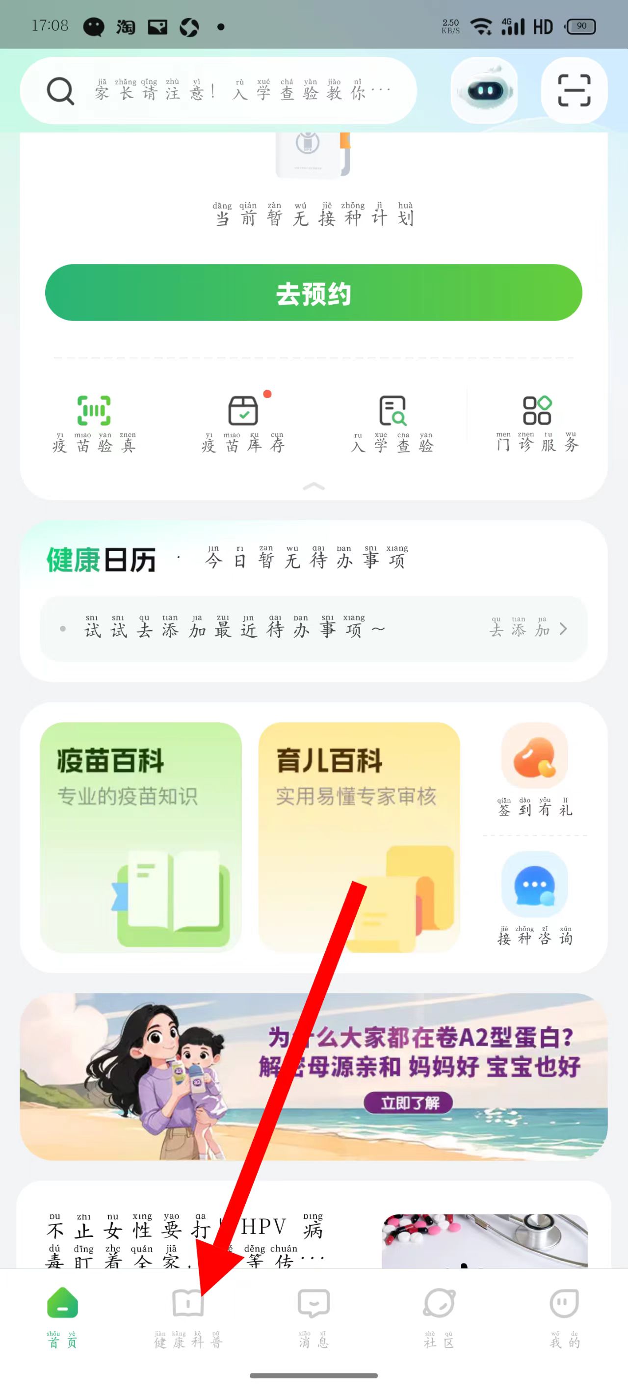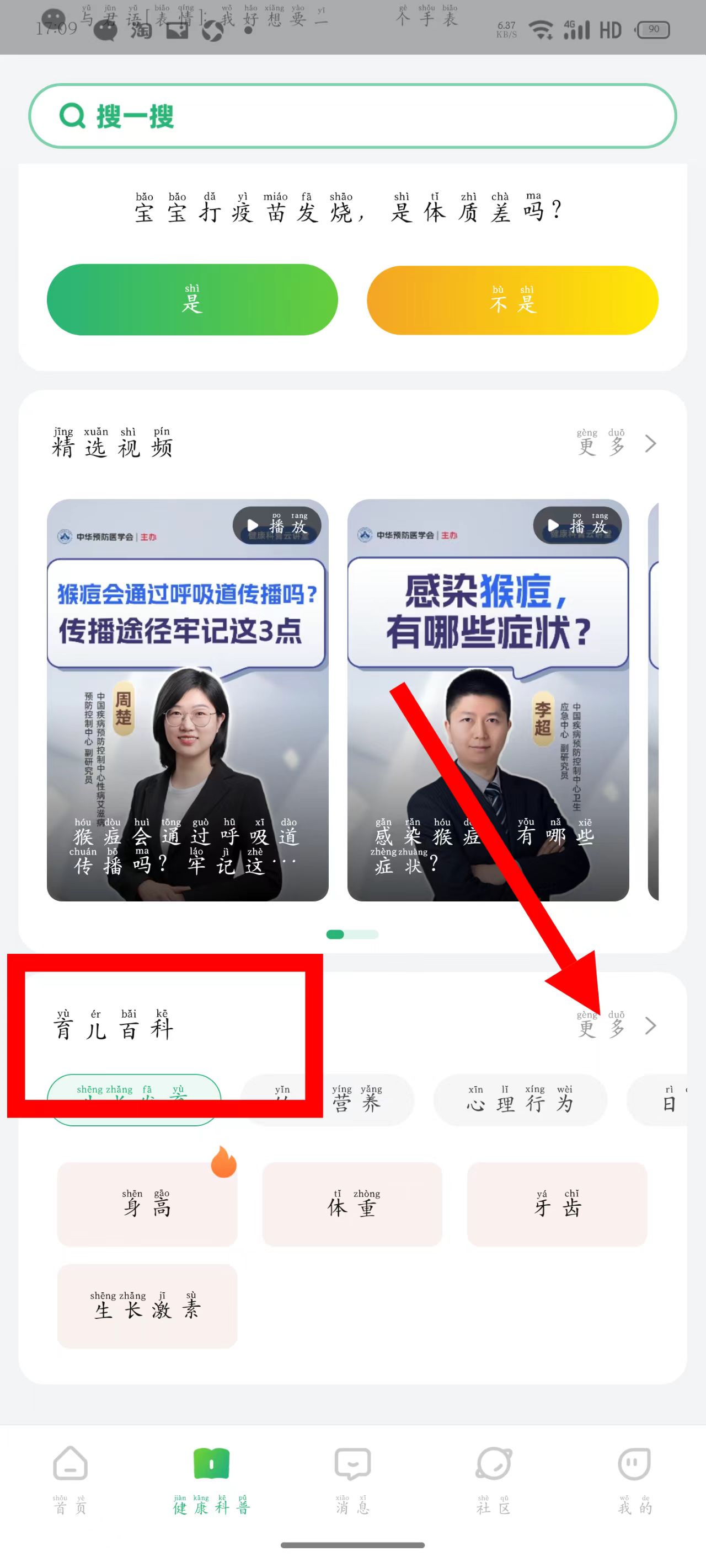 2、在健康科普页面,找到育儿百科板块,点击更多选项,进入育儿百科页面。