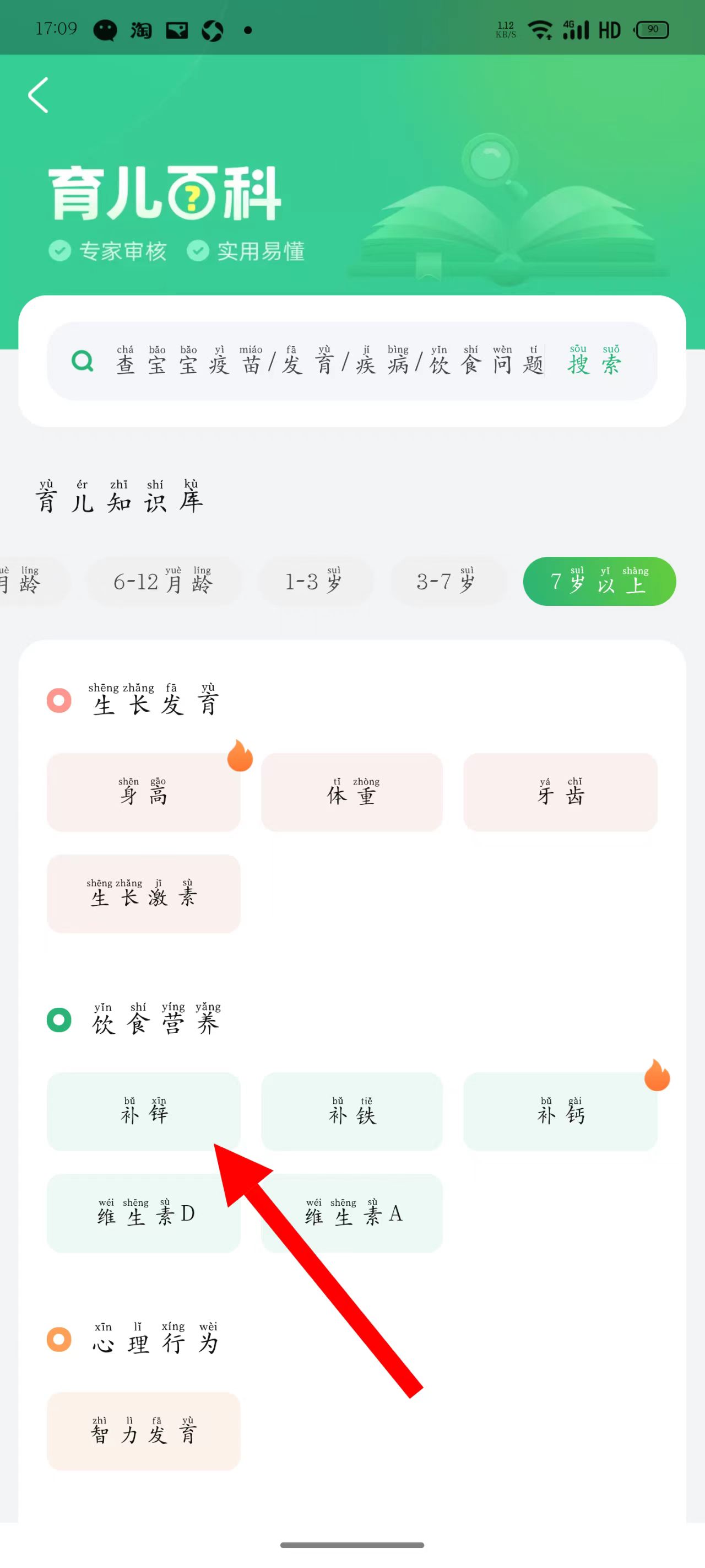 3、选择合适的儿童年龄段,在饮食营养分类下,点击补锌选项,进入补锌详情页面。