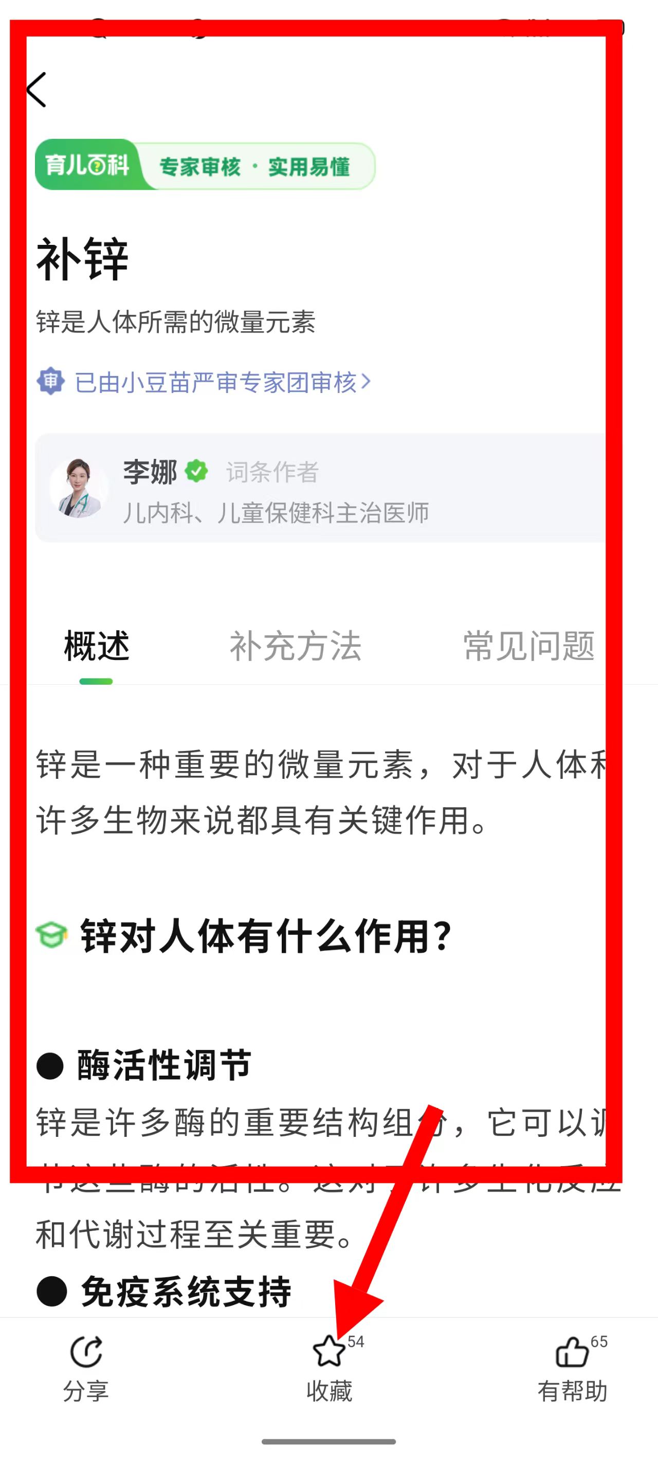 4、查看锌对人体的作用等内容,点击页面底部的收藏按钮即可。