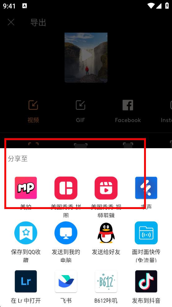 3、导出完成后,会弹出分享界面,可选择将处理后的照片分享至相应的平台,或者保存到手机相册等位置若要再次导入照片进行编辑。