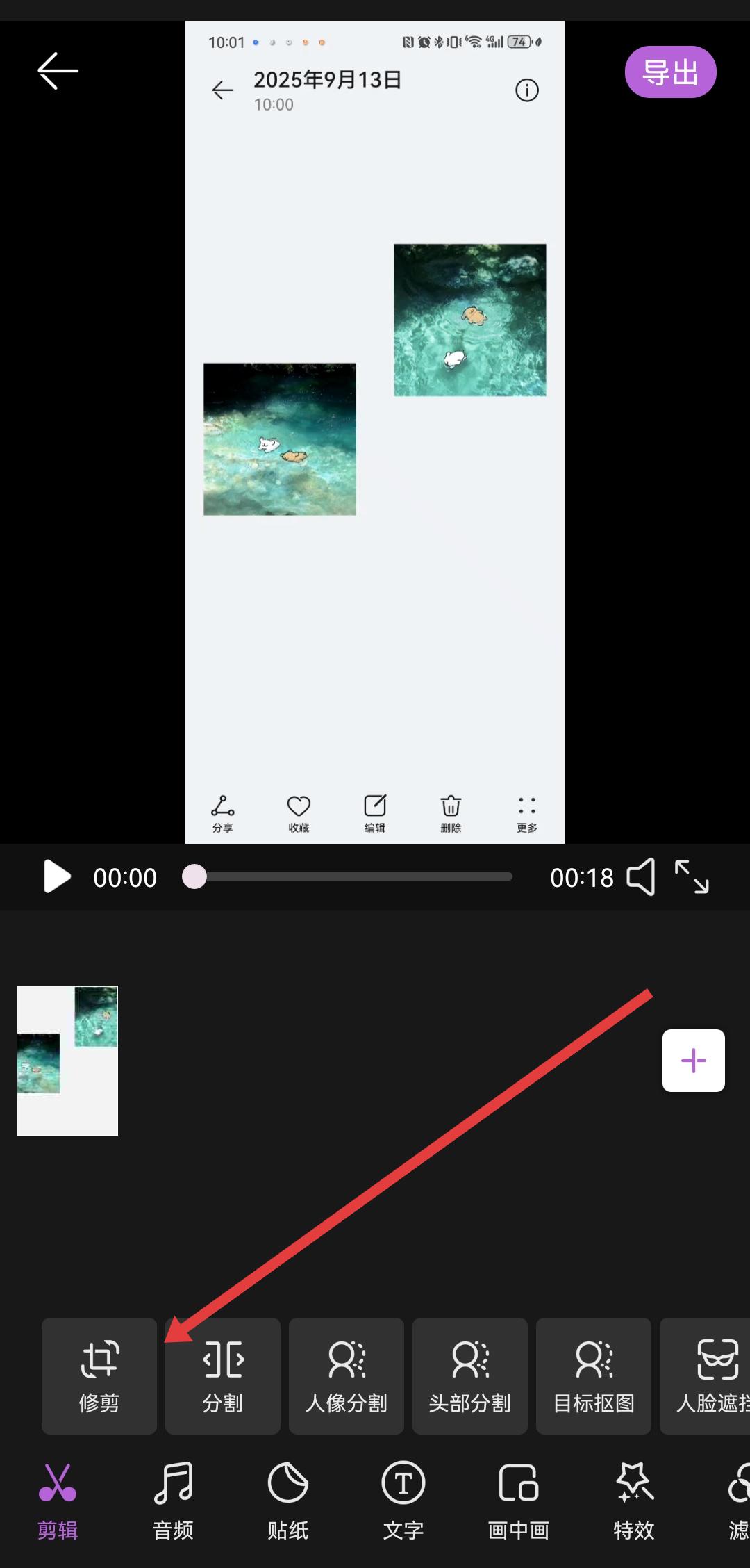 4、在视频编辑界面,使用底部工具栏功能进行视频制作,完成后导出保存视频。