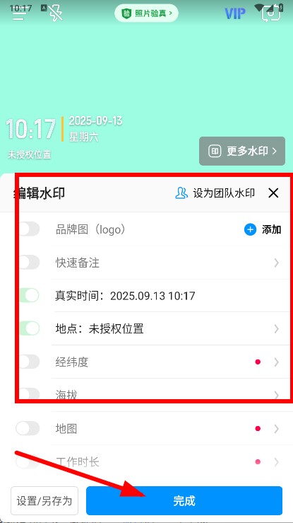 4、在编辑水印页面,设置品牌图、快速备注等内容,确认设置后,点击完成按钮,即可成功设置带有位置信息的水印。