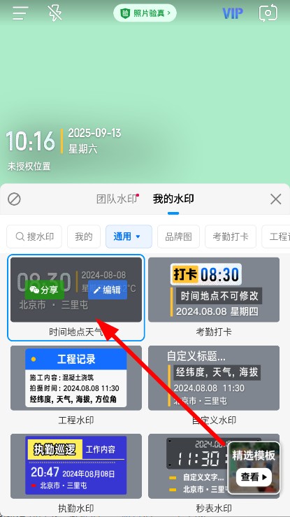 2、在水印选择界面,选择时间地点天气类水印模板,进入该水印的编辑页面。