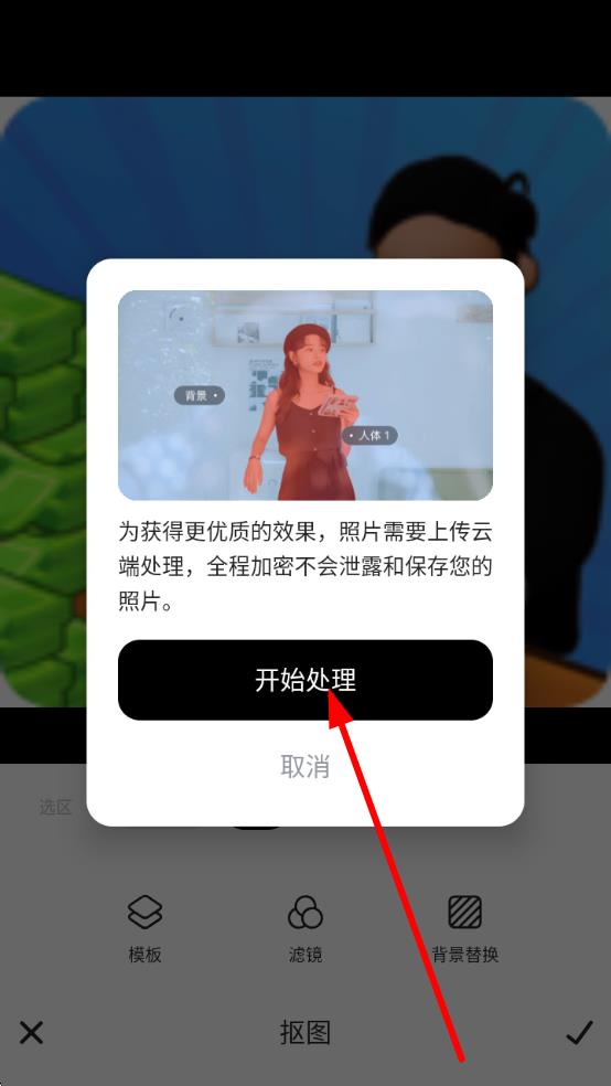 3、弹出提示框后,点击开始处理,美图秀秀将自动上传云端、加密处理,完成抠图,助力创意修图设计。