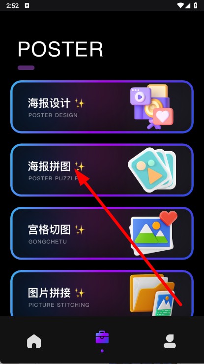 2、在功能选择页面,点击海报拼图选项,进入图片选择页面。