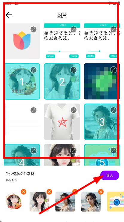 美食相机app怎么用的3、在图片选择页面,挑选至少2张想要制作海报的图片,选好后点击导入。