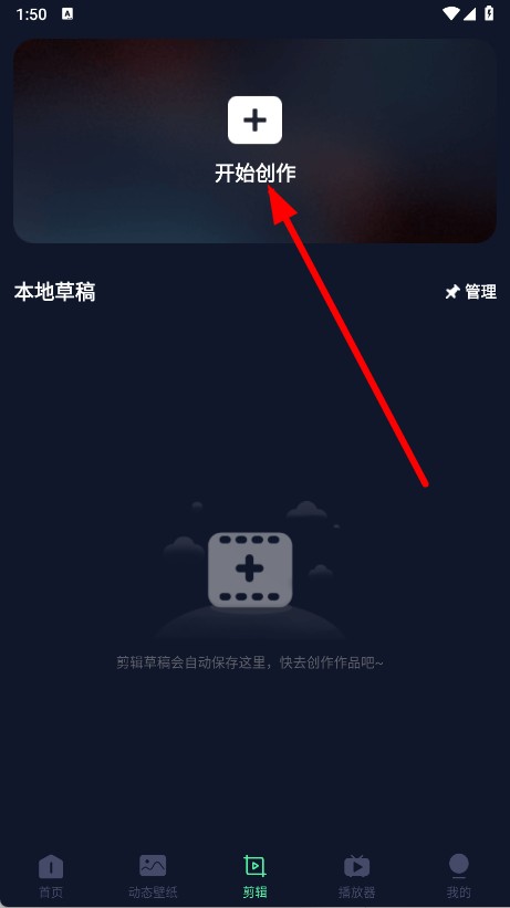 2、在剪辑页面,点击开始创作按钮,进入视频选择页面。
