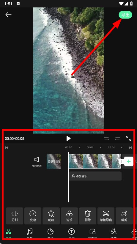 4、可使用功能进行剪辑,剪辑完成后点击右上角导出按钮,即可保存剪辑后的视频。