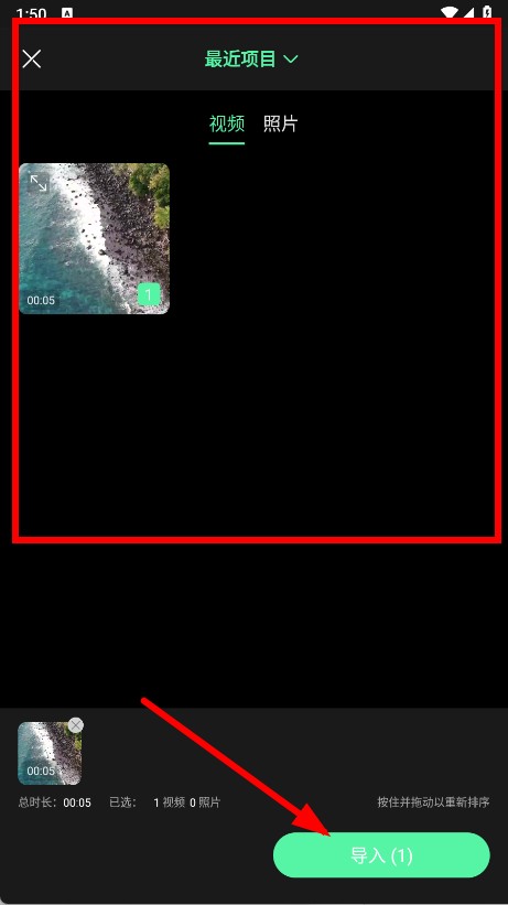 3、在视频选择页面,选择想要剪辑的视频,点击导入按钮。