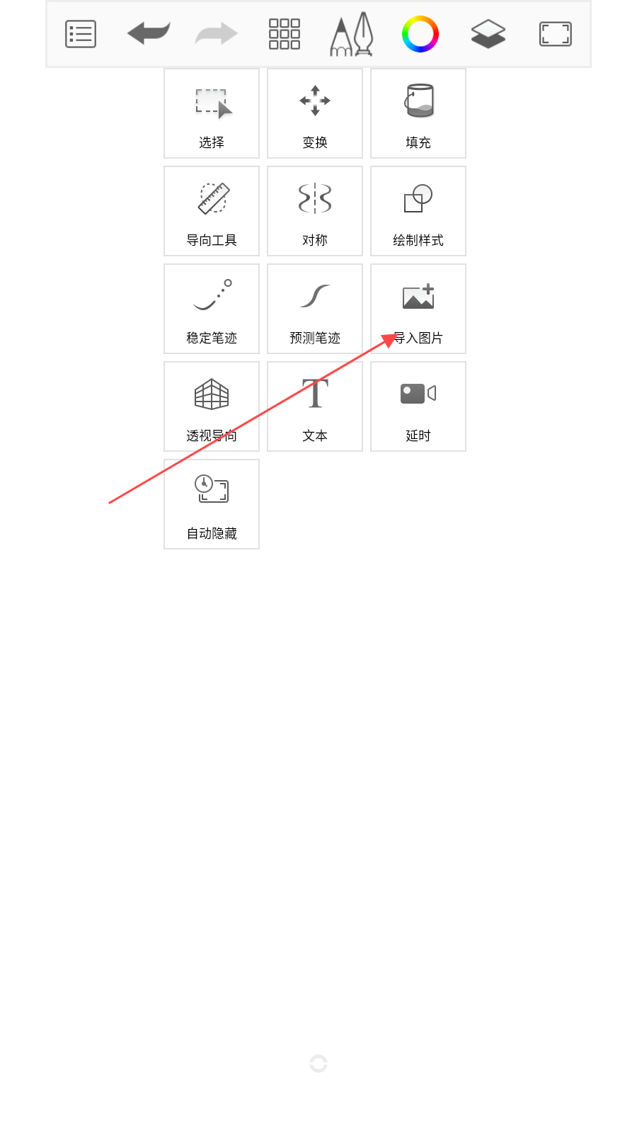 1、打开Sketchbook软件,点击界面上方功能菜单,找到并点击导入图片选项,进入图片导入流程。