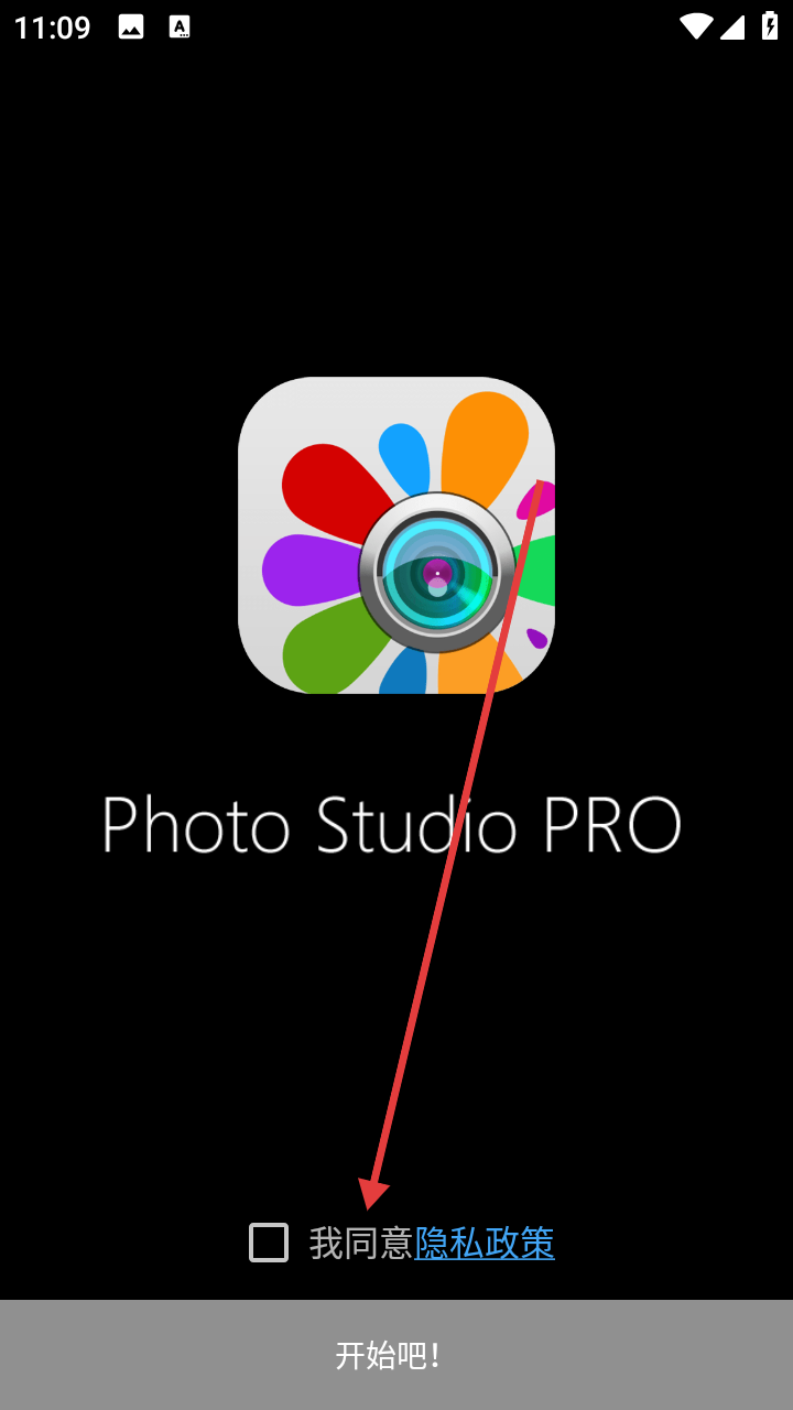 1、在Photo Studio PRO启动页,勾选我同意隐私政策复选框,点击下方开始吧按钮,即可进入应用。