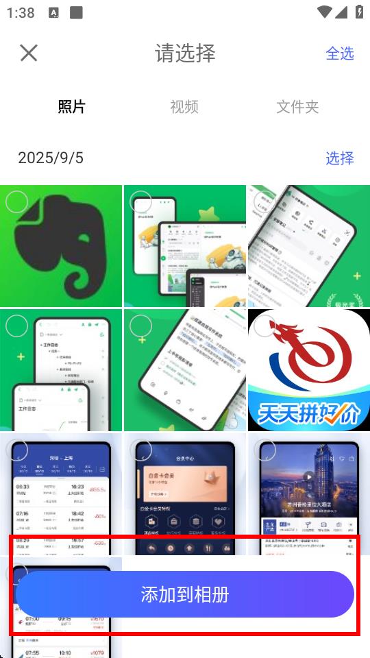 4、在弹出的选择界面,选择想要共享的照片、视频或文件夹,点击添加到相册,之后按照提示邀请他人加入共享相册即可完成共享。