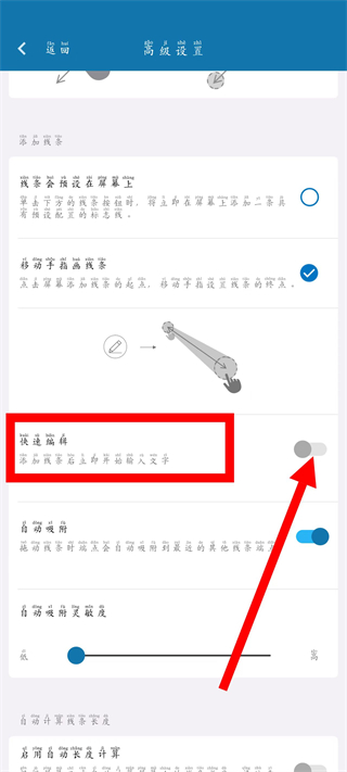 3、在高级设置页面,点击打开快速编辑,将其切换为开启状态。
