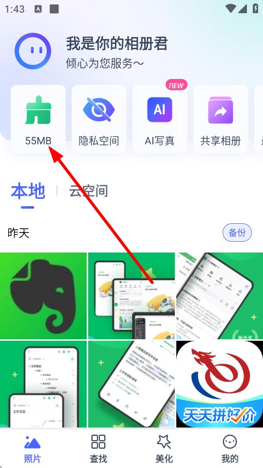 2、在照片页面中,点击55MB缓存显示区域。