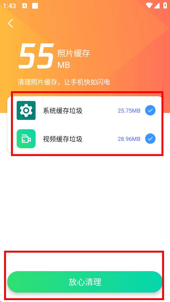 3、进入照片缓存清理界面后,选择需要清理的缓存类型,点击放心清理按钮。