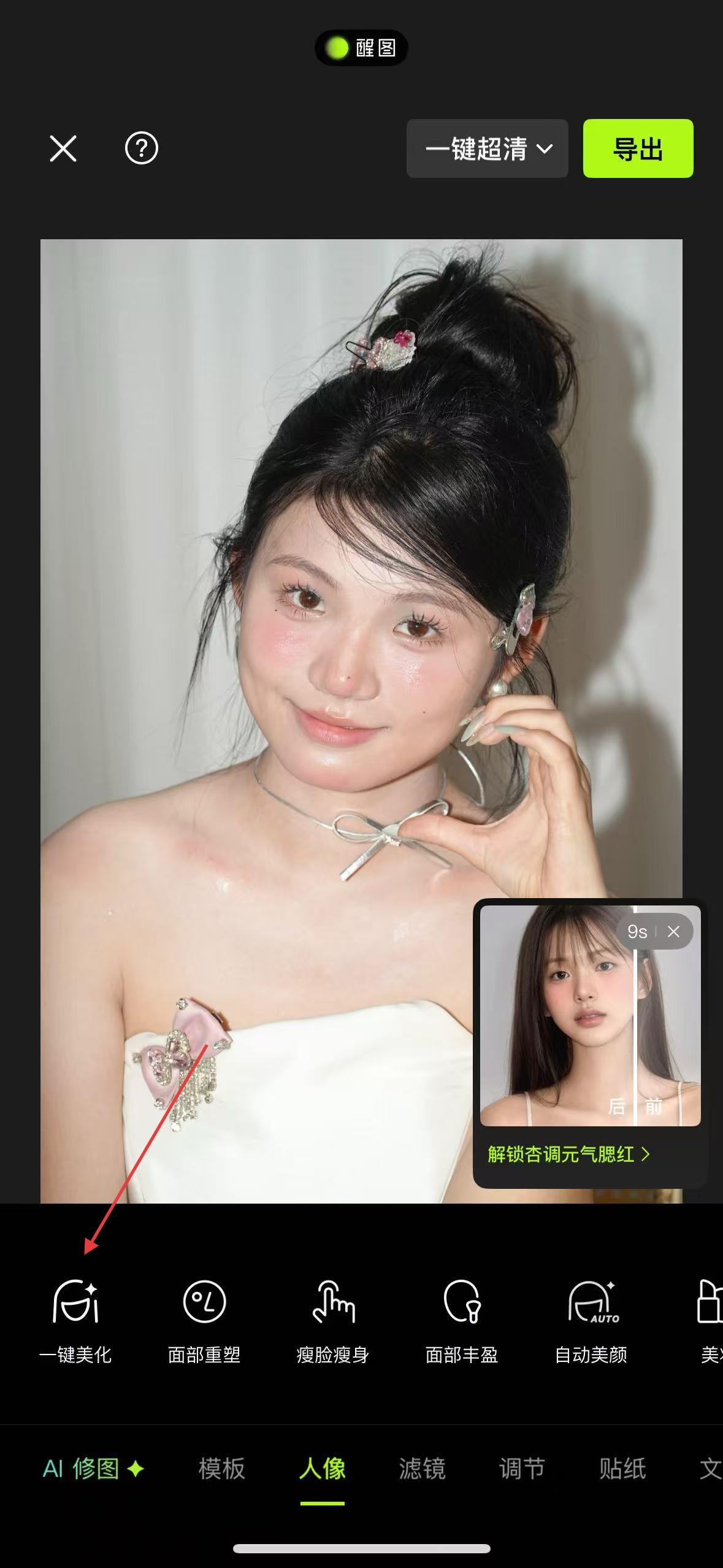 3、在照片编辑页面,点击一键美化选项,进入一键美化选择页面。