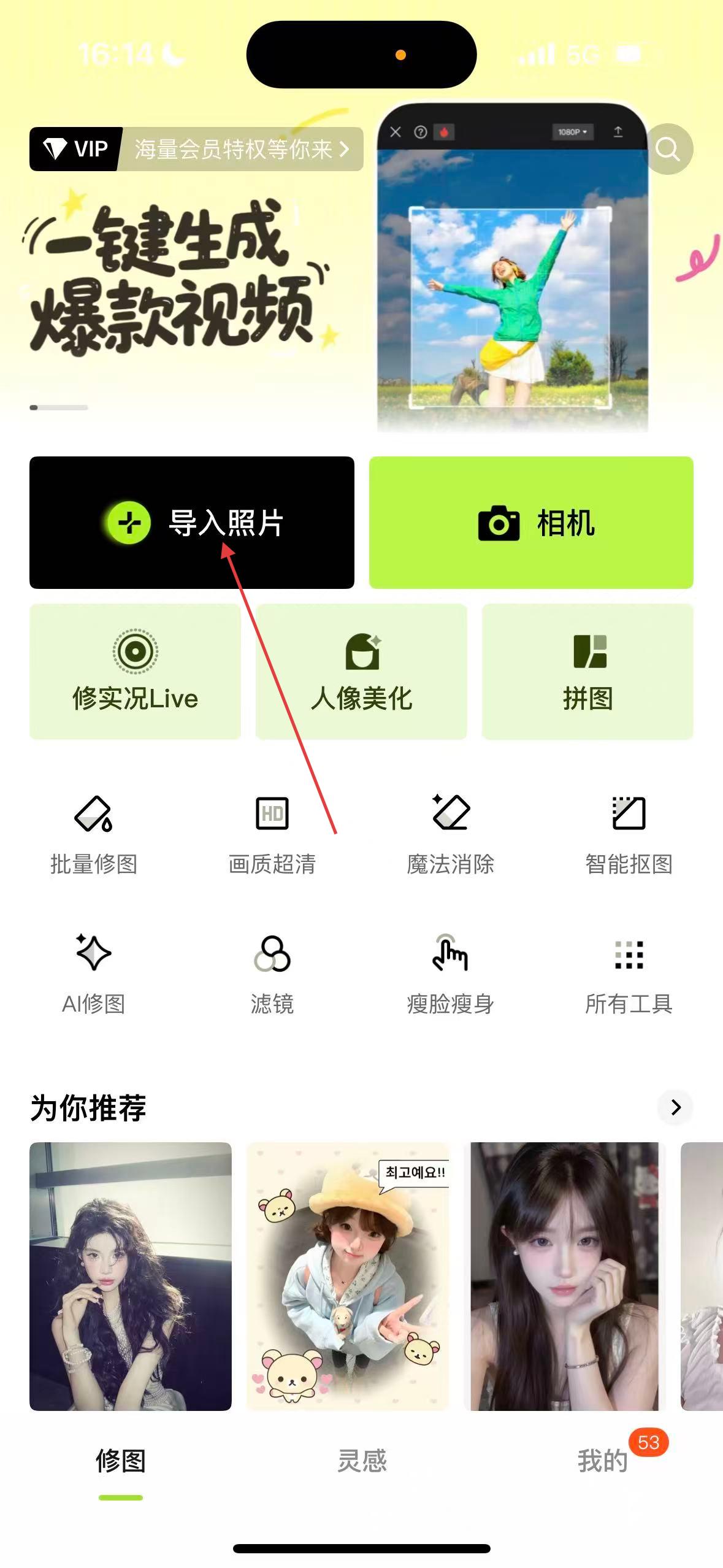 1、进入软件修图页面,点击导入照片选项,进入本地相册页面。