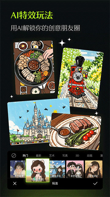 3、风格适配多元:提供的模板、滤镜与特效风格多样,既有清新自然、复古怀旧等日常风格,也有夸张趣味的漫画卡通风格,能适配不同风格类型图像的美化需求。