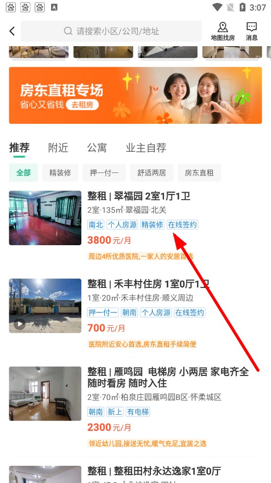 2、在租房页面浏览房源列表,找到心仪的房源后,点击房源标题进入详情页。