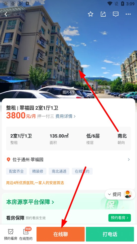 3、进入房源详情页,可查看房屋外观、户型等信息,若想进一步沟通,点击在线聊按钮联系房东。
