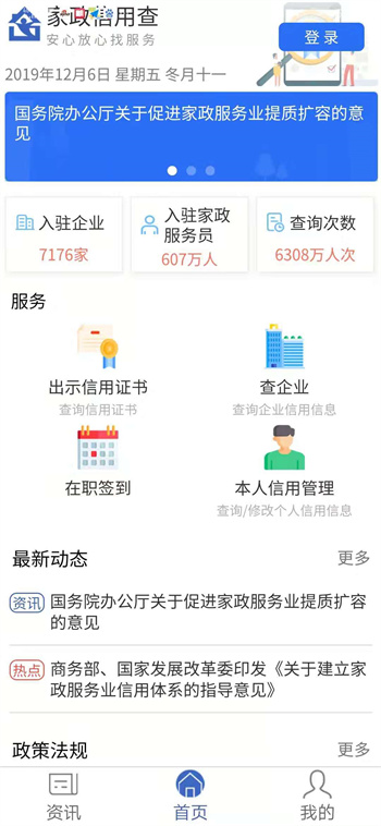 家政信用查服务员端app是一款供家政服务人员使用的家政服务app,用户可以在线查询企业信用,可以了解最新的行业政策法规,可以签到和录入自己的信息,欢迎有需要的朋友到下载使用!