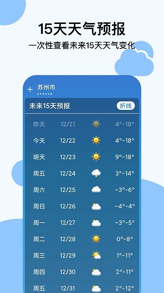 根据当地历史天气,结合天气大数据分析,为用户提供未来十五天天气预报,同时提供天气折线图、未来天气列表双模式动态展示。