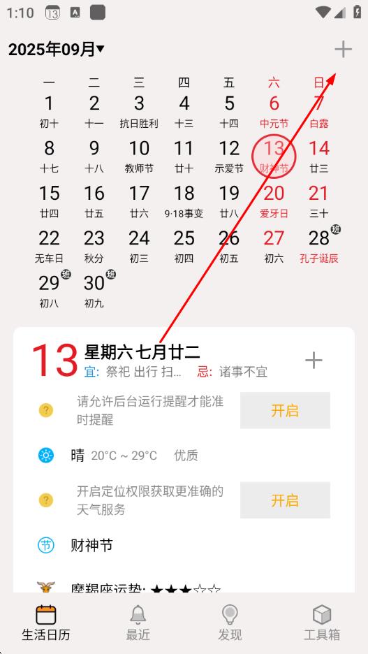 1、打开生活日历App,点击页面右上角的+号按钮。